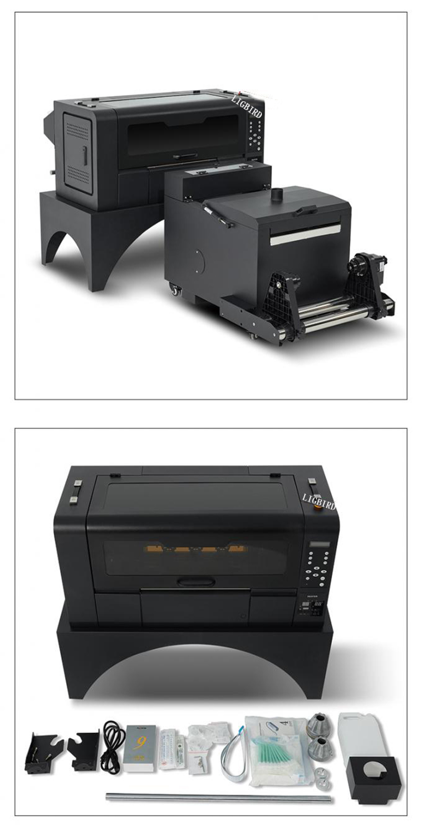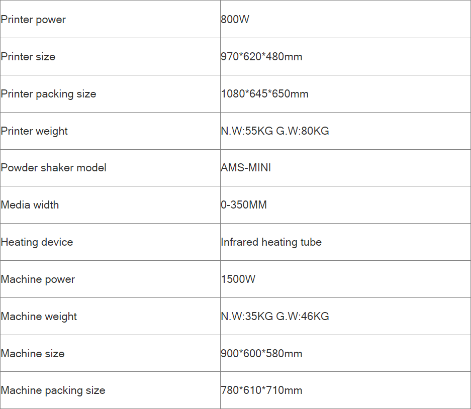 A set machine included printer and powder shaker oven.Printed pictures can be heat transferred to all fabrics.Such as T-shirts, hats, canvas bags, sweaters, mouse pads, etc.